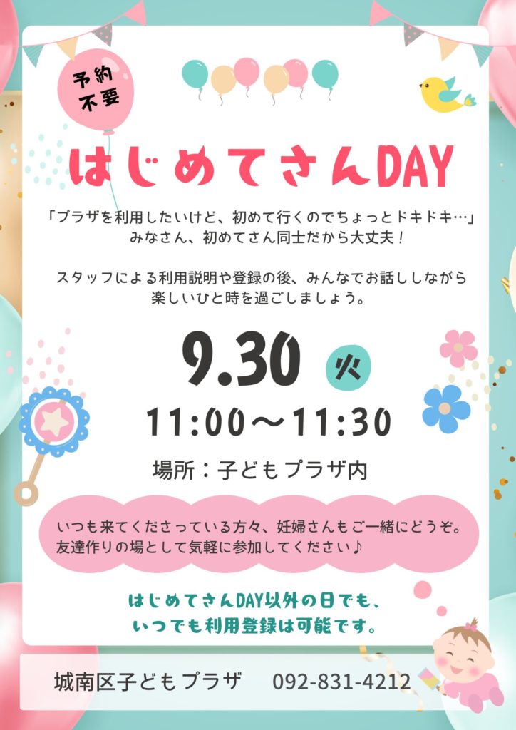 Home › お知らせ › 『はじめてさんDAY』のお知らせ 2025-08-27 『はじめてさんDAY』のお知らせ 『プラザを利用したいけど、初めて行くのでちょっとドキドキ・・・』そんな方たちにぜひ遊びに来ていただきたいはじめてさんDAY。 スタッフによる利用説明や登録の後、みんなでお話しながら楽しいひと時を過ごしましょう。 【9月の専門相談日のお知らせ】LINEビデオ通話で個別相談ができる日もあります。 『だっこびくす』のお知らせ