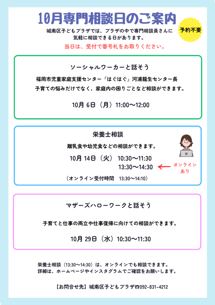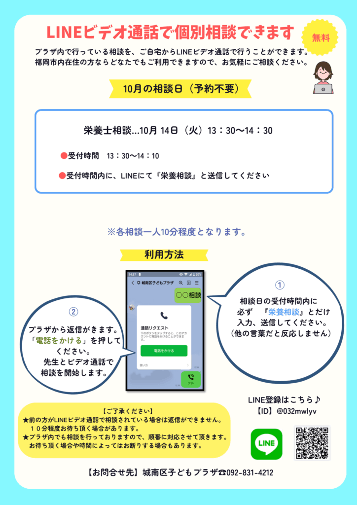 Home › お知らせ › 【10月の専門相談日のお知らせ】LINEビデオ通話で個別相談ができる日もあります。 2025-09-28 【10月の専門相談日のお知らせ】LINEビデオ通話で個別相談ができる日もあります。 『栄養士相談(13:30~14:30)』は、LINEビデオ通話で個別相談(オンライン)もできます。 城南区子どもプラザのLINEはこちら→ 【10月堤プレーパークのお知らせ】 『はじめての歯磨き講座』お知らせ