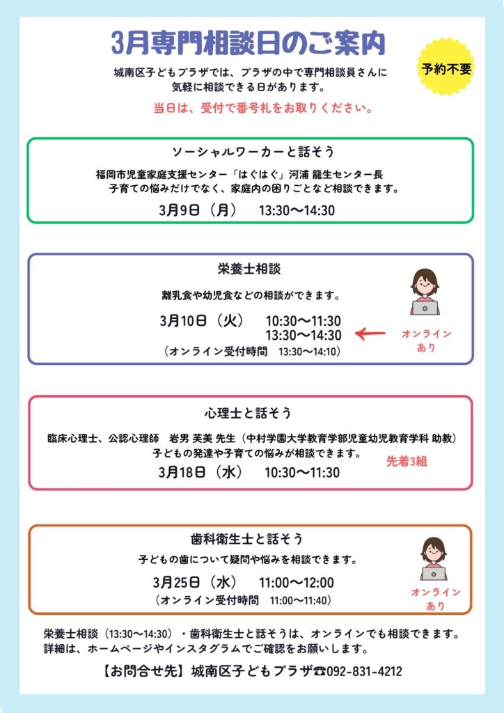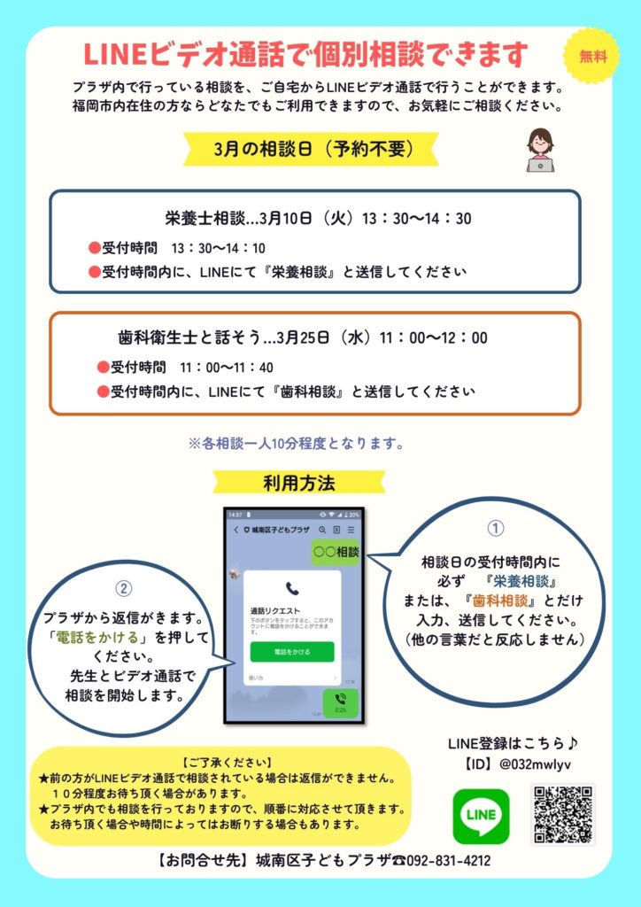 Home › お知らせ › 【3月の専門相談日のお知らせ】LINEビデオ通話で個別相談ができる日もあります。 2026-02-25 【3月の専門相談日のお知らせ】LINEビデオ通話で個別相談ができる日もあります。 『栄養士相談(13:30~14:30)』『歯科衛生士と話そう』は、LINEビデオ通話で個別相談(オンライン)もできます。 城南区子どもプラザのLINEはこちら→ ふたごちゃんDAYのお知らせ 【3月29日(日)赤ちゃんDAYのお知らせ】